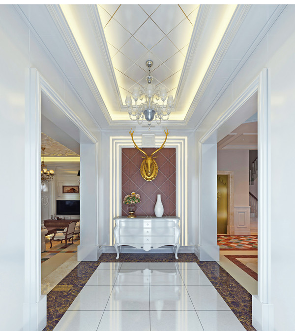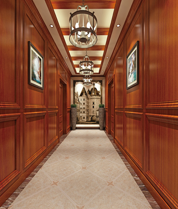 一般室内过道的上方会有梁,所以我们一般都是选择有吊顶的处理方式。吊顶宜简洁流程,图案以能体现韵律和节奏的线性为主,横向为佳。吊顶要和灯光的设计协调,顶面尽量用清浅的颜色,不要造成凌乱和压抑之感。